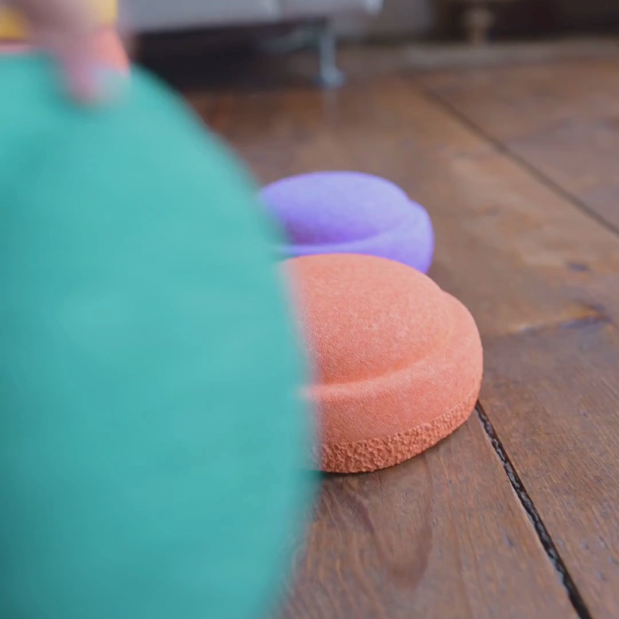 Ein Kind spielt auf dem Holzboden mit dem Stapelstein: Mini Regenbogen Classic (6 Steine), indem es einen kleinen grün-roten Becher hält und eine größere gelbe Kuppel berührt.